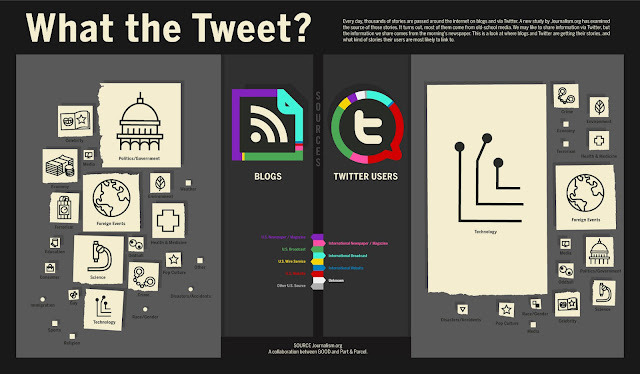 This infographic provides information for where bloggers and Twitters get the stories that they write and tweet about from. It shows that although blogging and Tweeting are new forms of media the stories that people post are from forms of old school media such as the newspaper. This infographic shows where the stories come from and what kind of stories are being blogged and Tweeted.